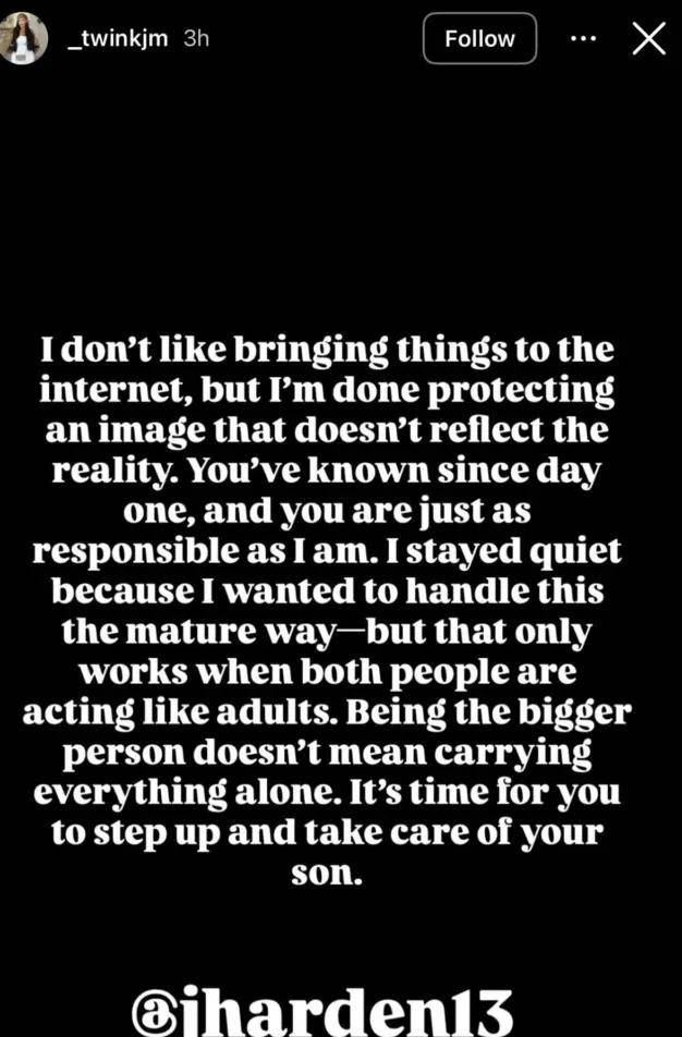 凯尔西-M在帖文中写道:“本来不想把这样的私事曝光网络,但我无力继续承担维持这虚假美好形象的代价。从一开始真相便已经明朗,你和我一样都要承担责任。我一直想以成年人应有的方式处理,可这必须建立在双方共同努力的基础上。沉默不代表我要背负所有重担。现在,是你挺身而出,对我们的儿子负起真正肩膀的时候了,@jharden13。”她Instagram主页还贴出了孕期照片,拍摄时间大约是在去年7到8月间,彰显这件事情并非新近事件。