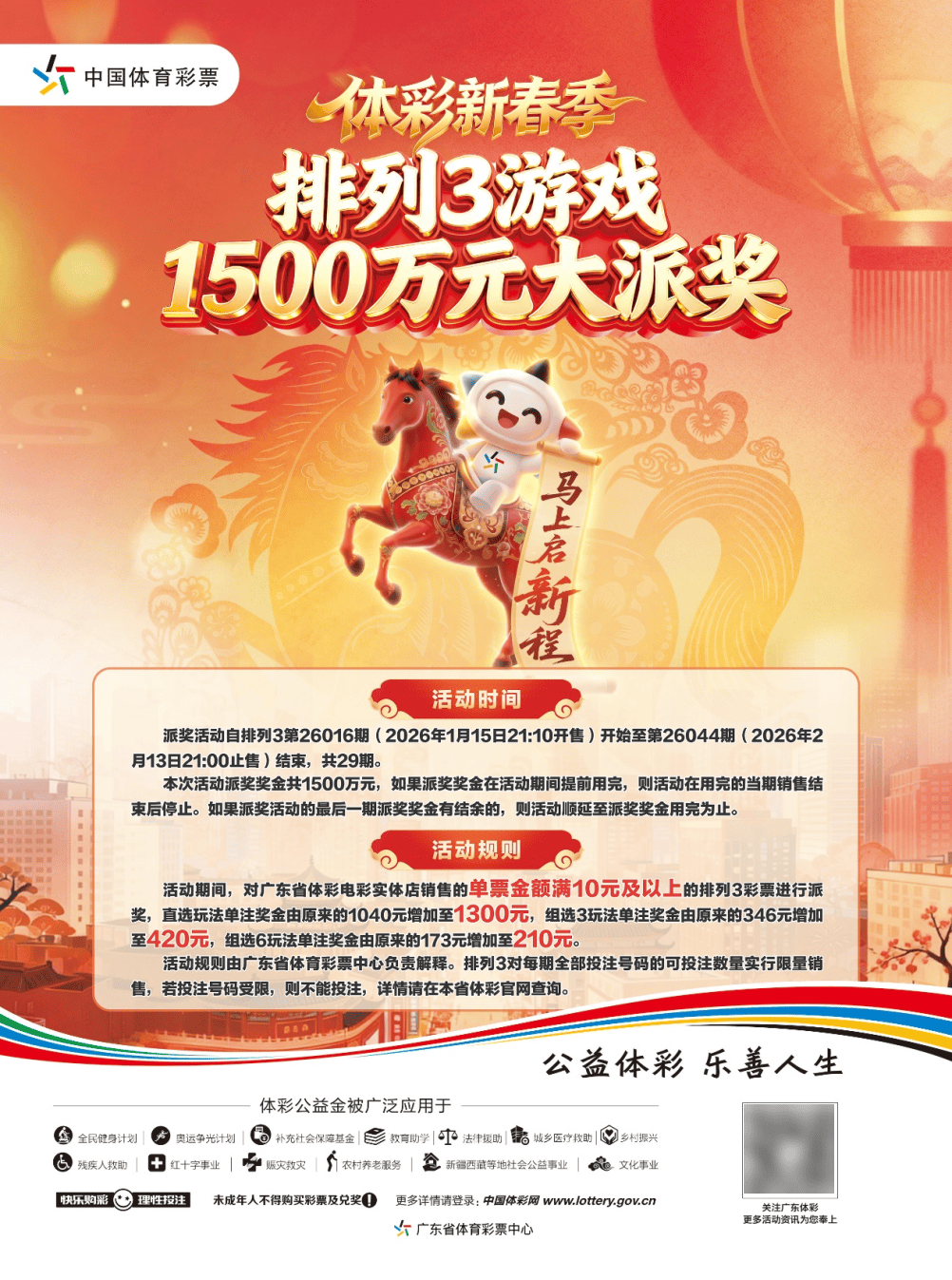 彩票,彩票平台,彩票网站,彩票APP下载,六合彩,快三马年的步伐已经向大家走来,新春的喜庆逐渐铺满每个角落。为庆祝新春马年,回馈广大购彩者,广东体彩将