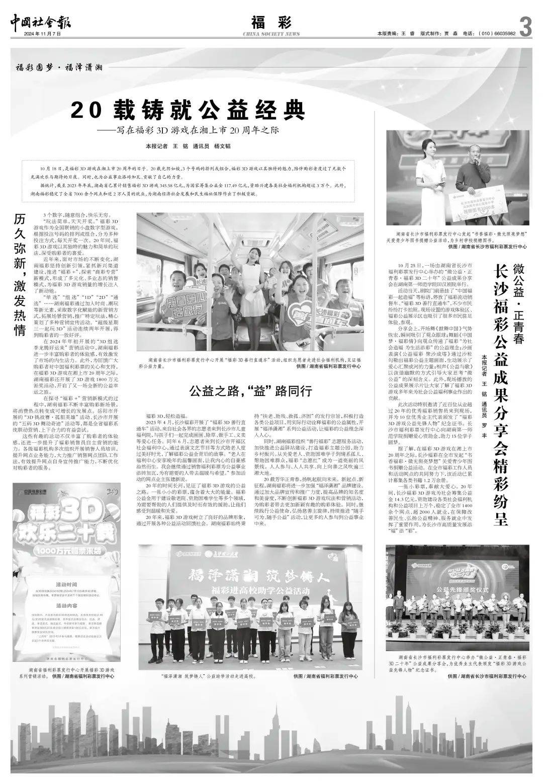 2023年4月,长沙福彩开展了“福彩3D善行直通车”活动,来自社会各界的志愿者来到长沙市儿童福利院,与孩子们一起完成画画、除草、做手工、义卖等爱心任务。同年6月,志愿者来到长沙市开福区社会福利中心,通过表演文艺节目等方式陪老人度过美好时光,了解福彩公益金背后的故事。“老人在福利中心安享晚年的温馨画面,让我内心的自豪感油然而生。我会继续通过销售福利彩票为公益事业添砖加瓦,为有需要的人带去温暖与希望。”参加活动的网点业主张建新说。