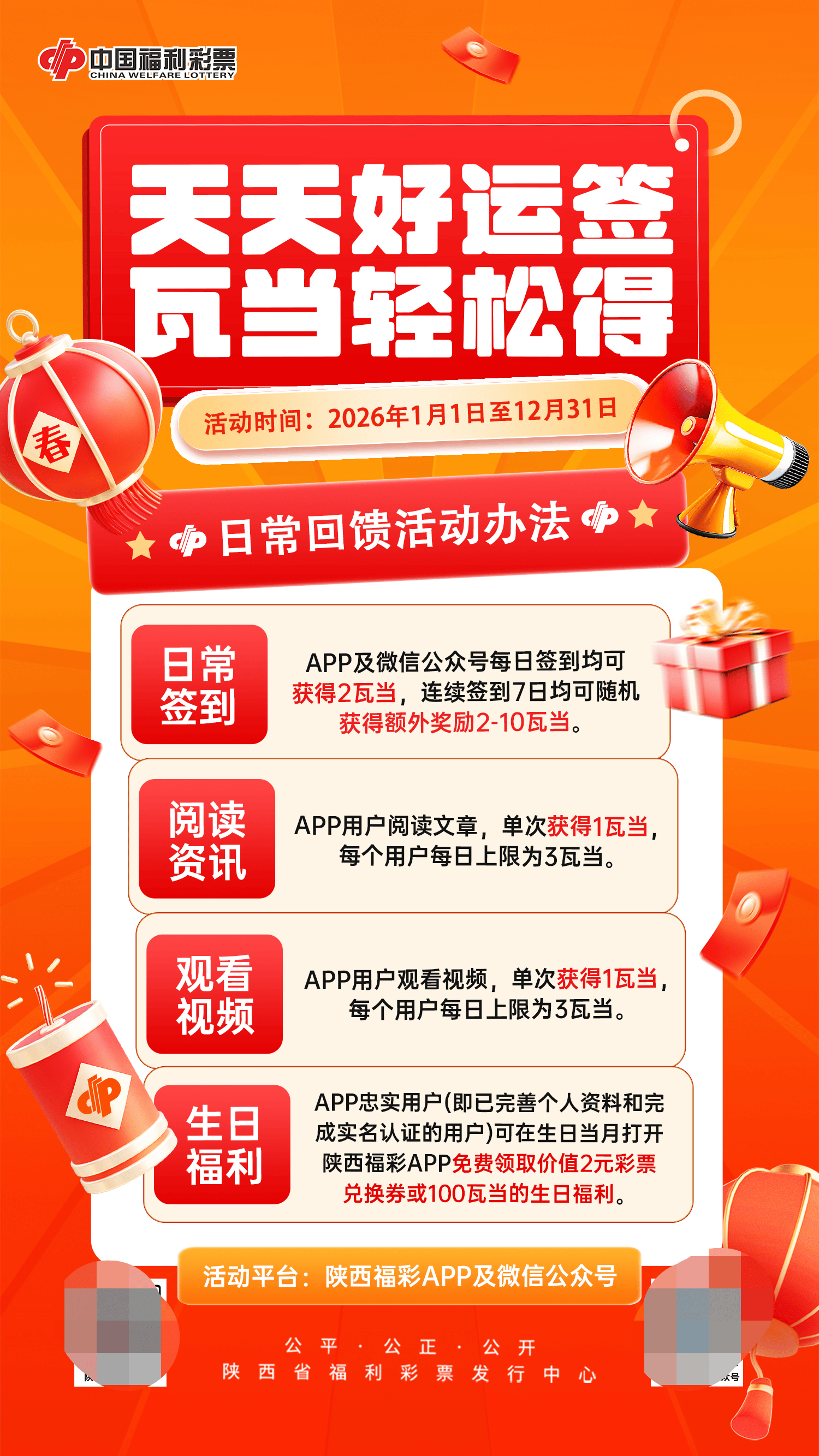 彩票,彩票平台,彩票网站,彩票APP下载,六合彩,快三为答谢全省购彩者长期以来对陕西福利彩票事业的关心与支持,持续提升品牌影响力与用户参与感,陕西省福利彩票发行中心自2026年1月1日起,正式开展为期一年的陕西福彩APP及微信公众号日常回馈活动,为广大用户带来贯穿全年的互动福利与暖心体验。