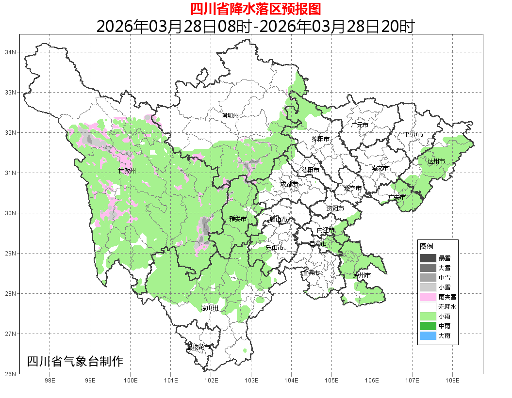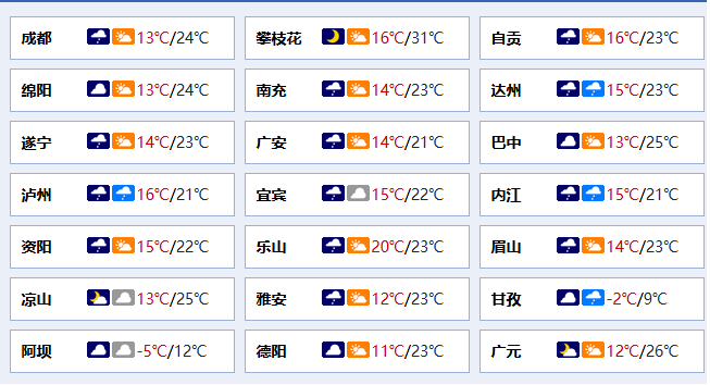 盆地大部多云间阴,东部边缘和西部沿山有阵雨;川西高原大部和凉山州北部多云间阴有阵雨(雪),攀西地区其余地方多云。24小时内,盆地最低气温:13~15℃;最高气温:西北部23~25℃,其余地方21~24℃。